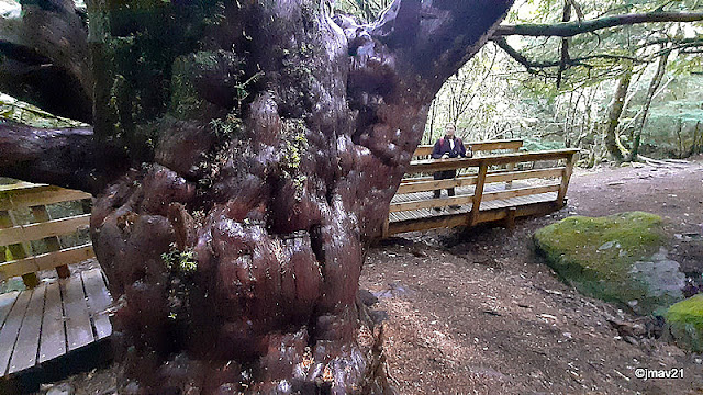 Dicen que hay más de cien tejos con más de mil años de vida, algunos con un perímetro de ocho metros. Nos salimos un momento de la senda de madera para una foto testimonial junto a uno de estos tatata......rabuelos que nacieron allá por el año 1000.