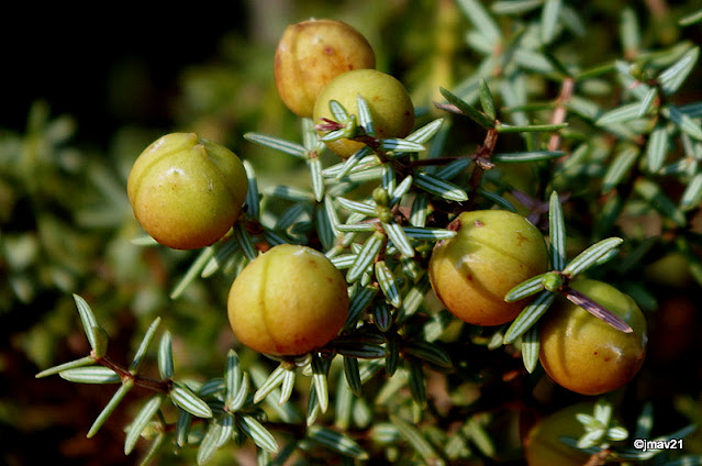 Tras varias vueltas por el pinar finalmente damos con algunos ejemplares cargados de frutos. Las bayas están ahora madurando, pasando del verde a un tono rojizo. Algunas son fáciles de estrujar y nos regalan un agradable olor a ginebra fresca.